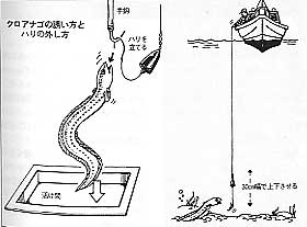 糸は太い。水面まで浮かせたら一気に船上に抜き上げ、水を張っていない活け間の上に吊す。そしてハリにギャフを掛けて、ハリを立てるとクロアナゴは活け間に落ちる。