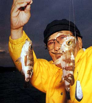 竿はやや下向きに構え、着底したら直ちにリールのストッパーをオンにして、ゆっくりと竿先を上げる。底は岩礁で仕掛けが掛かりやすいので、着底したら手際よく操作する。 「コッ」。魚信があったら、そのまま待つ。1〜2秒後に「ググッ」と引き込む。この釣りに”合わせ”は不要。明確な魚信で一気に引き込めば、上バリに掛かったのだから、ゆっくり竿を立てて、下バリへのフッキングを狙う。「グズグズ」と鈍い魚信だから下バリに掛かったのだから、そのまま待つか、少したるませてみる。が、大幅にたるませると、根がかりして、元も子もなくなってしまうので、待つ程度が無難だ。