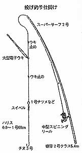 晩春から初夏にかけては、夜釣りも楽しい。 夜は釣り場の水深が概して浅いので、竿はオモリ負荷10号、長さ2.1m程度の先調子キス竿でもよい。小型両軸リールに2〜3号ナイロン。仕掛けは1.5号のミキ糸同柄20cmのエダスを2〜3本。オモリは15〜20号。ハリは丸セイゴ13〜15号など。